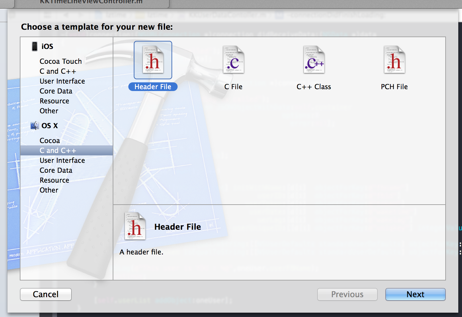 まずは、定数をまとめるヘッダーファイルの作成です。下記の画像のように “ C and C++ “ という項目から “ Header File “ を選びます。
