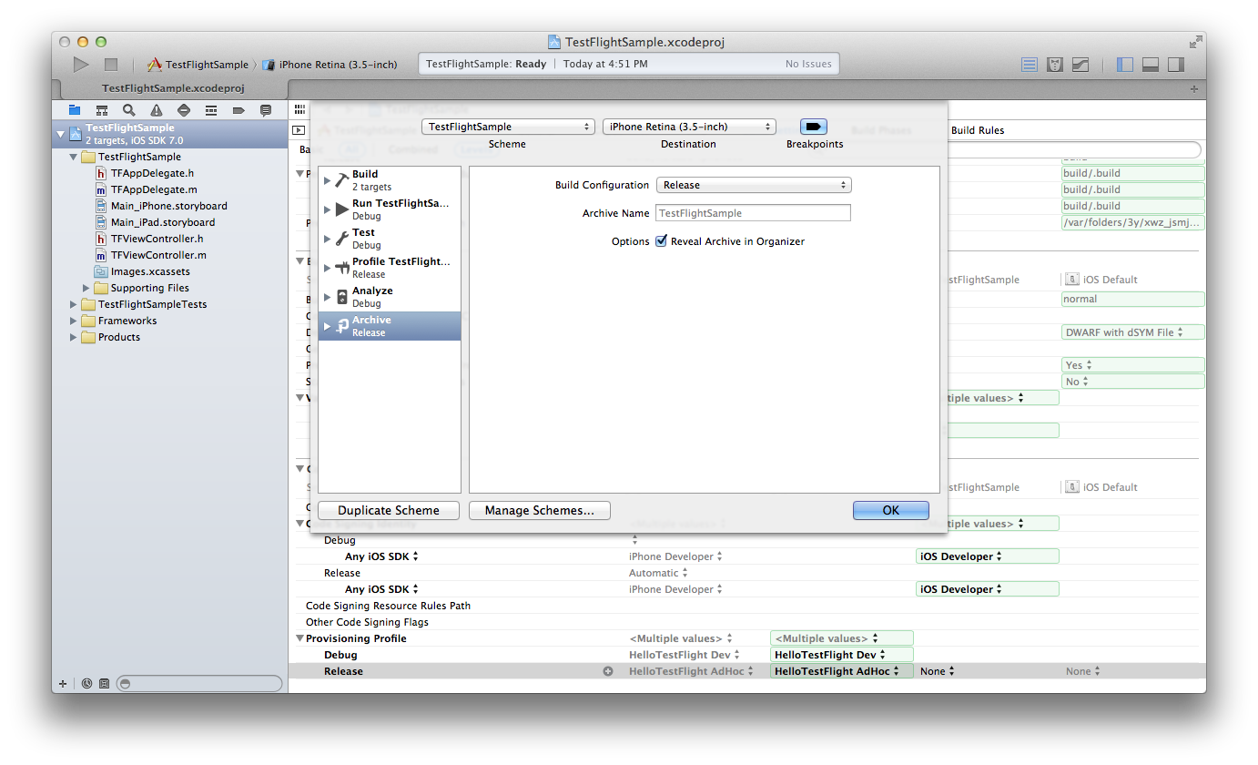 一番簡単に TestFlight にアップロードされる IPA を作成する方法は、アプリをアーカイブし Xcode のオーガナイザで生成する方法です。