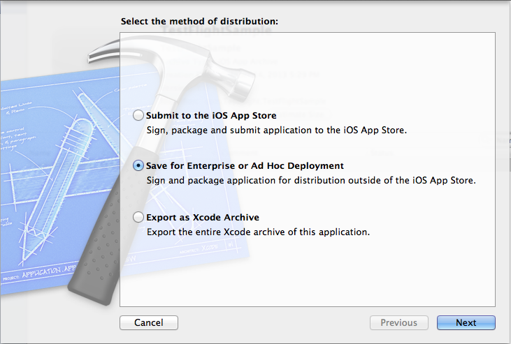 4 . Distributeボタンをクリックし、次のウィンドウで “Save for Enterprise or Ad-Hoc Deployment” を選択し、next。