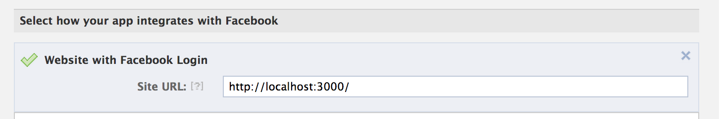 また、Facebookログインをサイトに組み込むには、Facebook側でアプリを作成し、自分のサイトを登録しておく必要があります。まず、ここ にアクセスし、アプリを作成します。アプリ作成に関しては特に問題ないと思います。ローカルで動作確認する際には、各アプリ設定ページ中程にある Website with Facebook Login という項目を有効にし、http://localhost:3000/ を設定します。これを忘れると、 Invalid blabala とエラーがでます。設定ページにある ”App ID” と ”App Secret” をあとで使います